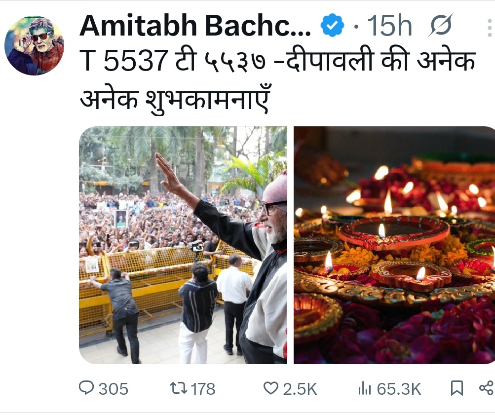 सदी के महानायक अमिताभ बच्चन ने अपने ऑफिशियल X अकाउंट (पहले ट्विटर) पर दिवाली की शुभकामनाएं देते हुए एक तस्वीर साझा की है। उन्होंने लिखा—